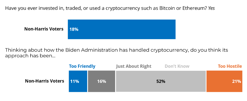 該調查涵蓋了804名註冊民主黨人,結果顯示13%的受訪者尚未決定是否支持哈里斯。在這些未定的選民中,18%的人有加密貨幣投資經歷,而其中有21%認為拜登政府對該行業的態度「過於敵視」。