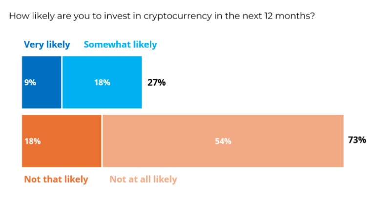 在這群人中,有9%的選民表示他們在來年“非常可能”會投資加密貨幣,18%的人則表示“可能會考慮”。另外,54%的選民則明確表示他們“完全不會”投資於這一新興行業。