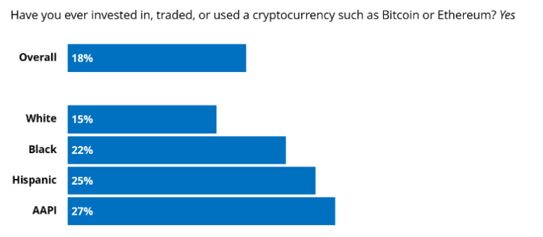同時,調查顯示,非白人民主黨選民對加密貨幣的支持明顯較高。在所有民主黨選民中有18%擁有加密貨幣,而在黑人民主黨選民中,這一比例為22%,西班牙裔民主黨選民為25%,亞裔美國人和太平洋島民民主黨選民則高達27%。