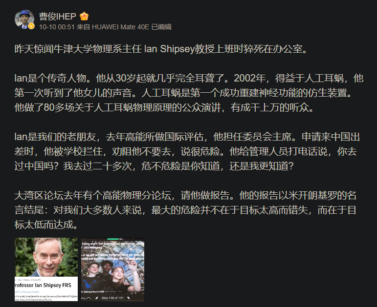 Ian Shipsey教授逝世後,牛津大學各界領導紛紛表達了對他的深切哀悼和欽佩之情。