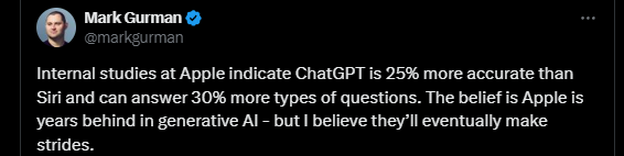 正如之前所述,蘋果內部的一些研究發現,ChatGPT準確率比Siri高25%,可以回答的問題類型多30%。