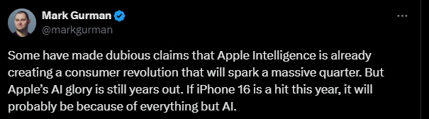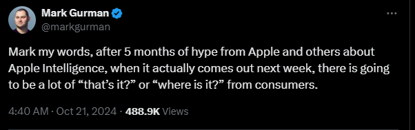 他寫道:記住我的話,在Apple和其他人對Apple Intelligence進行了5個月的炒作之後,當它真正在下週發佈時,會有很多「就這?」或「它在哪裏?」之類的來自消費者的評論。