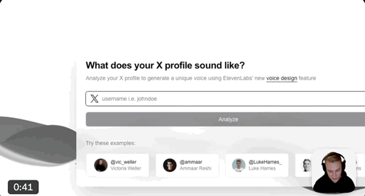 8.ElevenLabs推出了X to Voice,這是一款開源應用程序,利用其新的Voice Design API,可以根據X個人資料創建獨特的AI語音。該應用集成了Apify的個人資料數據和Hedra Labs的頭像動畫