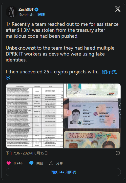 鏈上偵探 ZachXBT 最新的推文指出,他發現了一個由 21 位北韓開發者組成的駭客犯罪網路,參與並盜取了數十個加密專案資金,據稱每月能賺取高達 50 萬美元的不法收入。