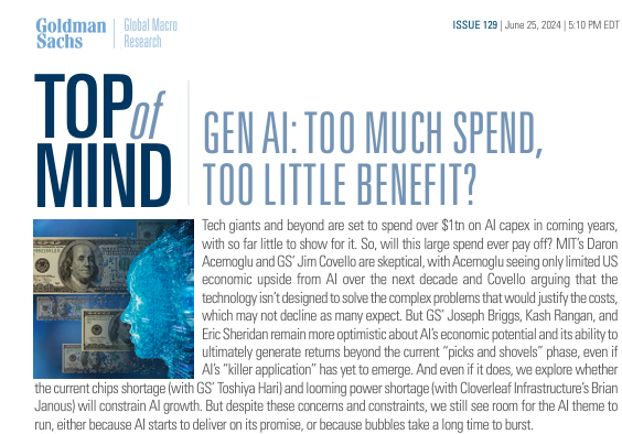 在6月,高盛曾髮佈過一份報告,名爲「生成式AI:投入過多,收益太少?」。