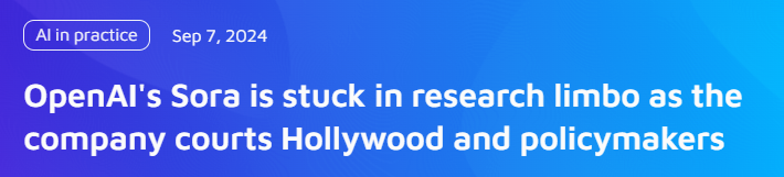 外媒稱,Sora可能在研究上陷入了睏境。一方麵是必須要和政府深入探討安全風險;另一方麵則亟需好萊塢和藝術家們的入駐合作。