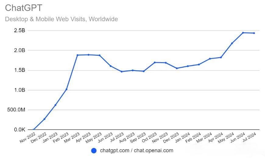 ChatGPT的全球用戶正在迅速增長:從2022年11月到2024年7月,桌麵和移動訪問量激增,在6月和7月達到近25億次訪問的峰值