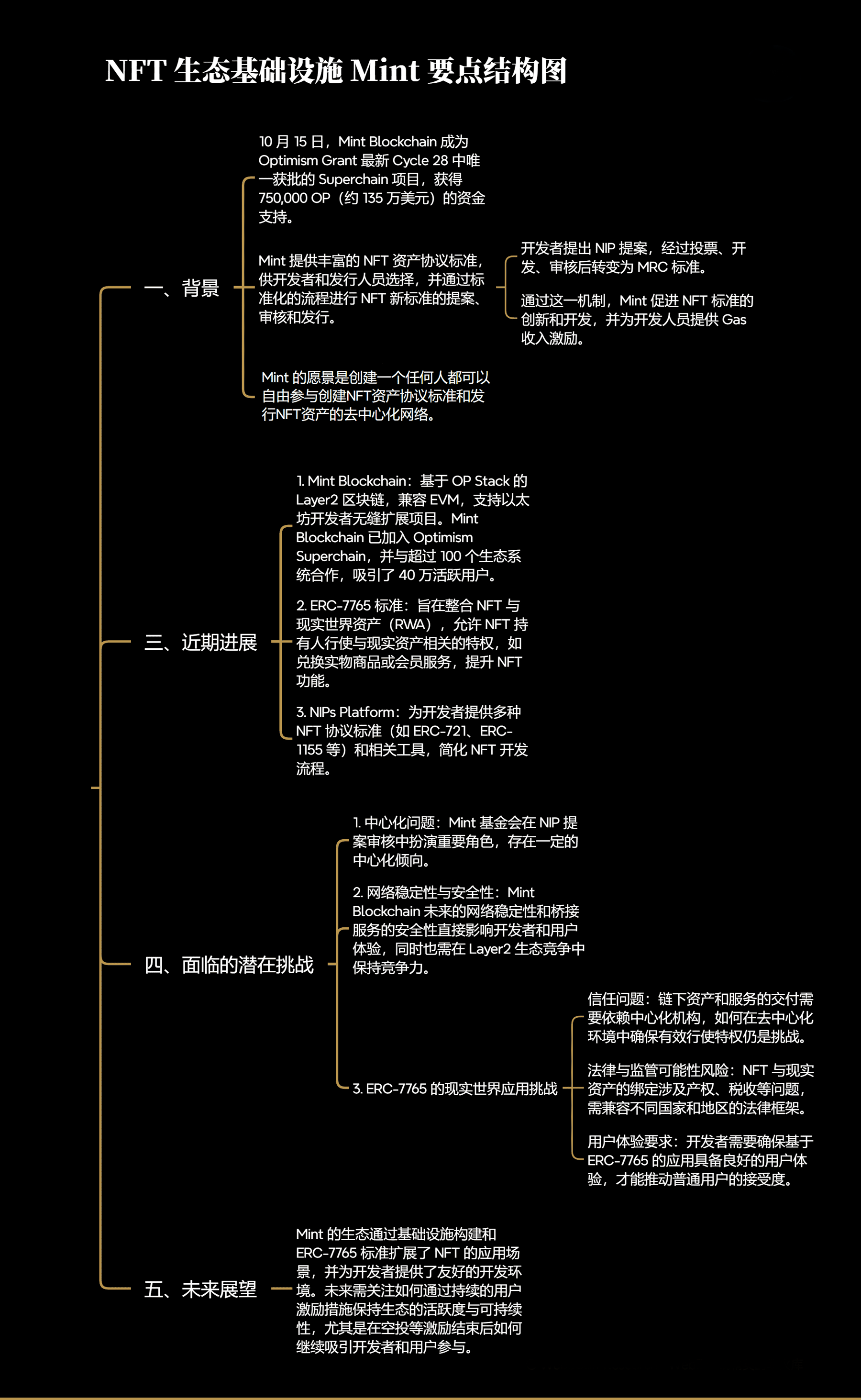 綜上所述,Mint 團隊正在圍繞NFT 構建系列基礎設施。其中,MintBlockchain 為開發者部署資產和開發應用提供了基礎支撐;ERC-7765 使NFT 的應用場景得以擴充,並有望成為鏈上與鏈下資產融合的重要橋樑;而 NIPPatorm 對於多標準和系列工具的融合更是為開發者打造了一個友好的開發環境。可以説,這些舉措不僅能夠幫助 Mint 生態吸引到更多的生態開發者,還能夠推動整個 NFT領域的發展進程。然而,Mint 的系列解決方案也面臨着一些潛在挑戰。首先,Mint 基金會在NIP提案的審核過程中扮演了非常重要的角色,使得整個提案審批流程存在一定的中心化。同時,Mint Blockchain 作為 Mint 生態的基礎,其網絡穩定性、橋接服務的安全性都直接關係着開發者和用户的使用體驗,並且與其他L2 相互競爭,Mint Blockchain 同樣也需要在生態系統建立層面保持充足的市場競爭力。此外,ERC765 試圖將 NFT與現實資產(例如實物商品、會員服務等)掛鈎,那麼 ERC-7765的實際運用也將涉及到鏈下資產的信任、法律與監管風險及用户體驗挑戰等問題,1)鏈下資產的信任問題,儘管 ERC-7765 通過智能合約為特權行使提供了鏈上保障,但當 NFT 的特權與鏈下的現實世界資產或服務綁定時,依然存在信任問題,鏈下資產的交付或服務的執行黑要依賴中心化機構或第三方的合作,用户雲要信任這些機構能夠正確履行其承諾。因此,如何在去中心化的環境中確保鏈下特權的有效行使仍然是一個挑戰;2)法律與監管風險問題,ERC-7765涉及到特權的行使和權益管理,這可能會引發複雜的法律和監管問題,例如,NFHT 持有者通過行使特權獲得的實物資產,可能需要遵守所在國家的產權、税收或消費法。這些問題目前在不同國家和地區的法律框架下需要進一步保持兼容;3)對於應用層有着更高的用户體驗要求,如果用户體驗設計不夠友好,可能會阻礙普通用户對ERC-7765的廣泛接受。因此,開發者需要在構建基於ERC-7765 的應用時,注重用户體驗的設計,確保普通用户能夠輕鬆上手。[2]另外值得注意的是,上文提到 Mint會將部分GaS收入分配給 NHT 標準的開發人員,以及為了鼓勵更多開發者加入與吸引(更多用户參與到生態中來,Mint 團隊還推出了空投的激勵計劃,而一旦涉及到空投這類短期性的激勵行為,團隊就需要特別關注如何在空投結束後繼續保持用户和開發者的活躍度與熱情,只有這樣,該生態才能更具有可持續性。