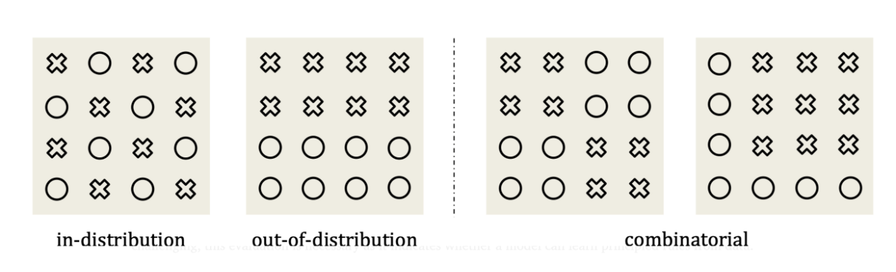 3.組合泛化(Combinatorial Generalization):介於ID和OOD之間的一種場景,訓練數據中包含各種“概念”或物體,但並非所有可能的組合都出現過。模型需要學習如何將已有的知識組合起來,應用到新的組合場景中