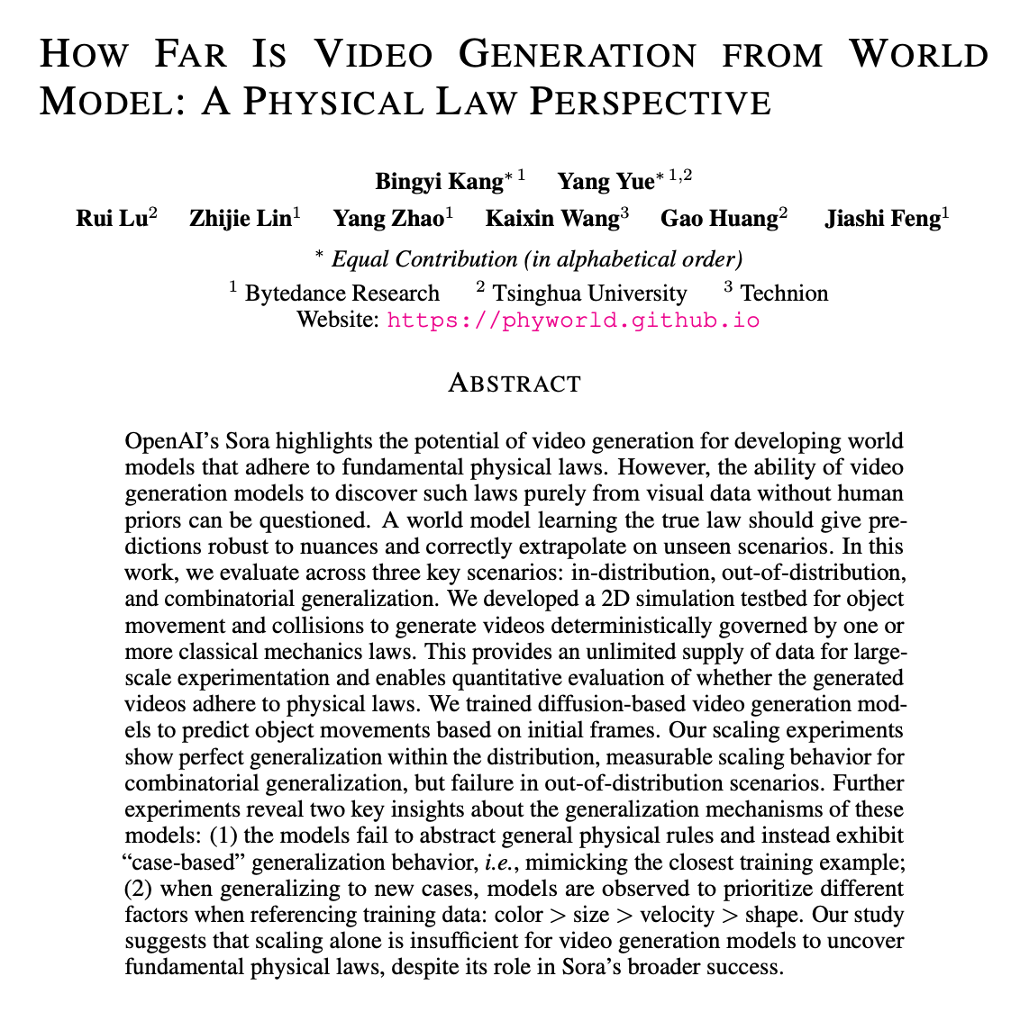 OpenAI的Sora驚豔亮相,以及現在眾多視頻生成模型其強大的視頻生成能力引發了熱議,甚至有人認為它已經初步具備了世界模型的雛形,能夠理解並運用物理規律。但事實果真如此嗎?字節跳動AI實驗室的研究人員對此提出了質疑,並開展了一項系統性的研究,旨在探究視頻生成模型是否真的能夠從視頻數據中學習物理規律