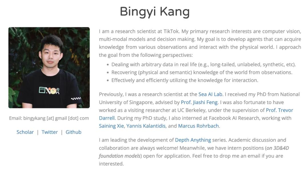 3.有效和高效地利用這些知識進行交互此前是Sea AI lab的研究科學家。在新加坡國立大學獲得博士學位,導師是Jiashi Feng教授。在加州大學伯克利分校擔任客座研究員,師從 Trevor Darrell 教授。在攻讀博士學位期間,曾在 Facebook 人工智能研究院實習,與謝賽寧、Yannis Kalantidis 和 Marcus Rohrbach 共事。正在領導開發Depth Anything都可以系列