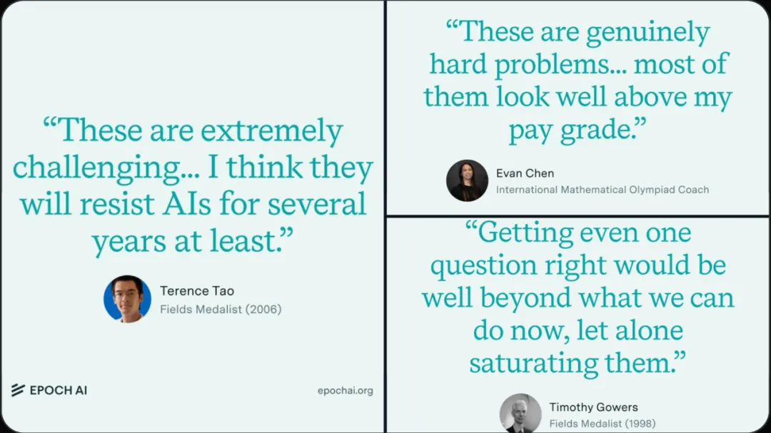 為了進一步驗證FrontierMath的難度,Epoch AI還特意採訪了多位菲爾茲獎(數學界的最高榮譽)得主,包括陶哲軒 (2006)、蒂莫西·高爾斯 (1998)、理查德·博赫茲 (1998),以及國際數學奧林匹克競賽 (IMO) 教練陳誼廷 (Evan Chen)。這些大佬們一致認為,FrontierMath的題目非常具有挑戰性,需要深厚的專業知識和強大的推理能力才能解決