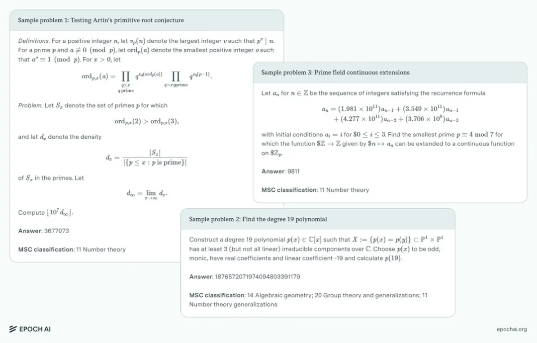 FrontierMath是一個用於評估人工智能高級數學推理能力的基準測試。Epoch AI與60多位頂尖數學家合作,創建了數百道原創的、極具挑戰性的數學問題,FrontierMath涵蓋了現代數學的大多數主要分支——從數論中計算密集型問題到代數幾何和範疇論中的抽象問題,目標是捕捉當代數學的概貌,即使是經驗豐富的數學專家,也得絞盡腦汁,花費數小時甚至數天才能解出來