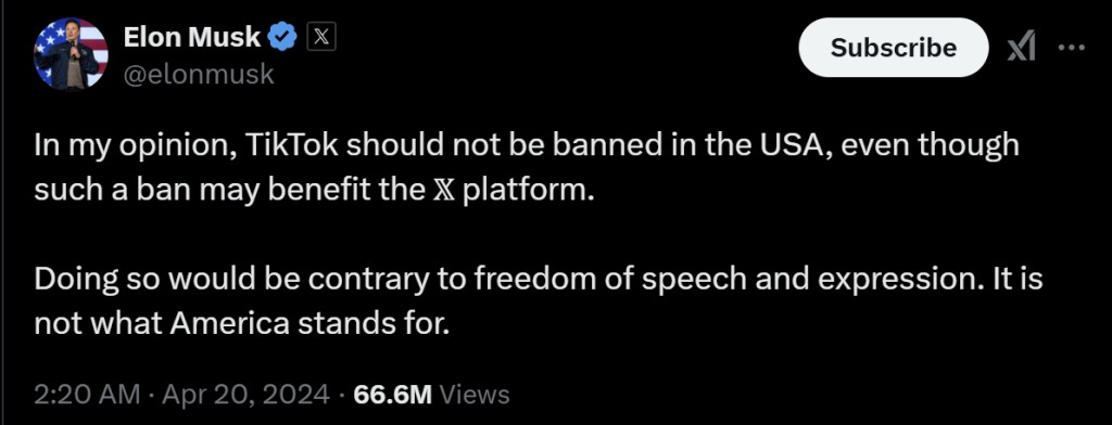 馬斯克曾在 4 月發文:「我認為,TikTok 不應該在美國被禁止,儘管這樣的禁令可能有利於 X 平台。這樣做將違背言論自由,不應是美國的立場。」