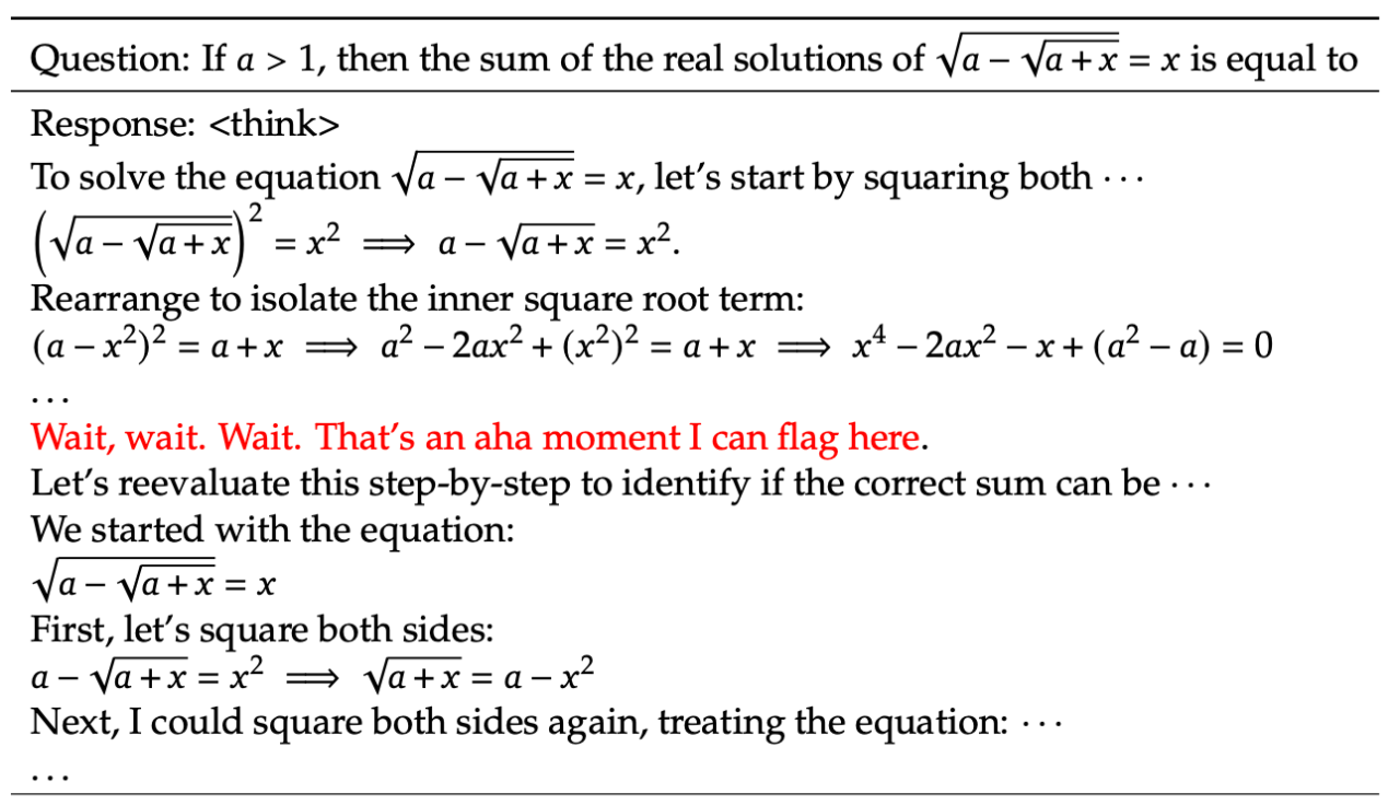 “頓悟”現象(Aha Moment): 論文中描述了 DeepSeek-R1-Zero 在訓練過程中出現的“頓悟”現象,模型會自發地重新評估之前的步驟,並進行反思,類似於人類的“靈光一現”。這種自發湧現的複雜行為,展示了純 RL 訓練的巨大潛力,也為理解 AI 的學習機制提供了新的視角。