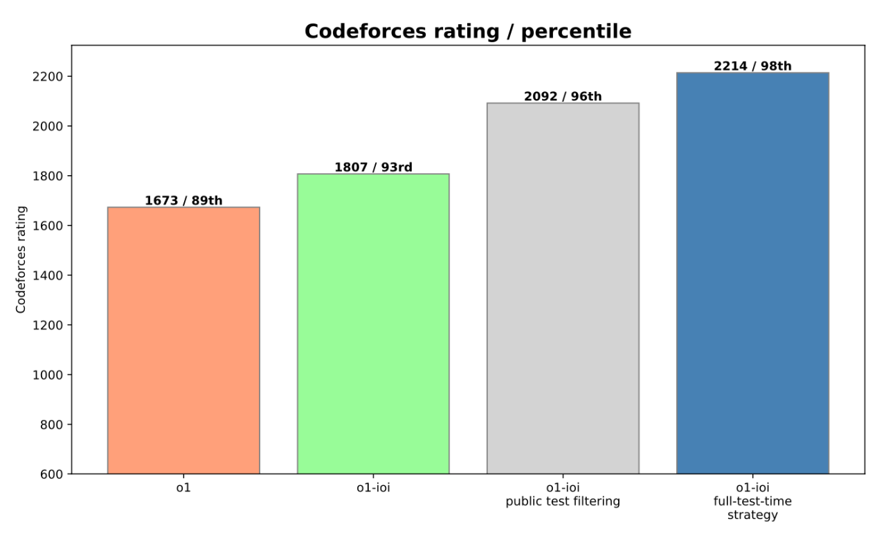 報告中還提到,這些 手工策略 非常有效,為 o1-ioi 的 IOI 成績 提升了約 60 分,在 Codeforces 上的 percentile 排名也 提升了 5% (從 93% 提升到 98%, Elo 評分達到 2214 分)。