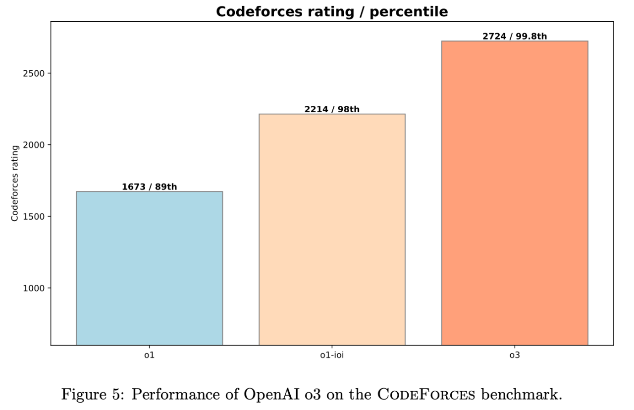 o3 模型在 Codeforces 上的 Elo 評分更是達到了 2724 分 (99.8th percentile), 全球排名 Top 0.2%, 接近 全球 Top 175 名 的水平!