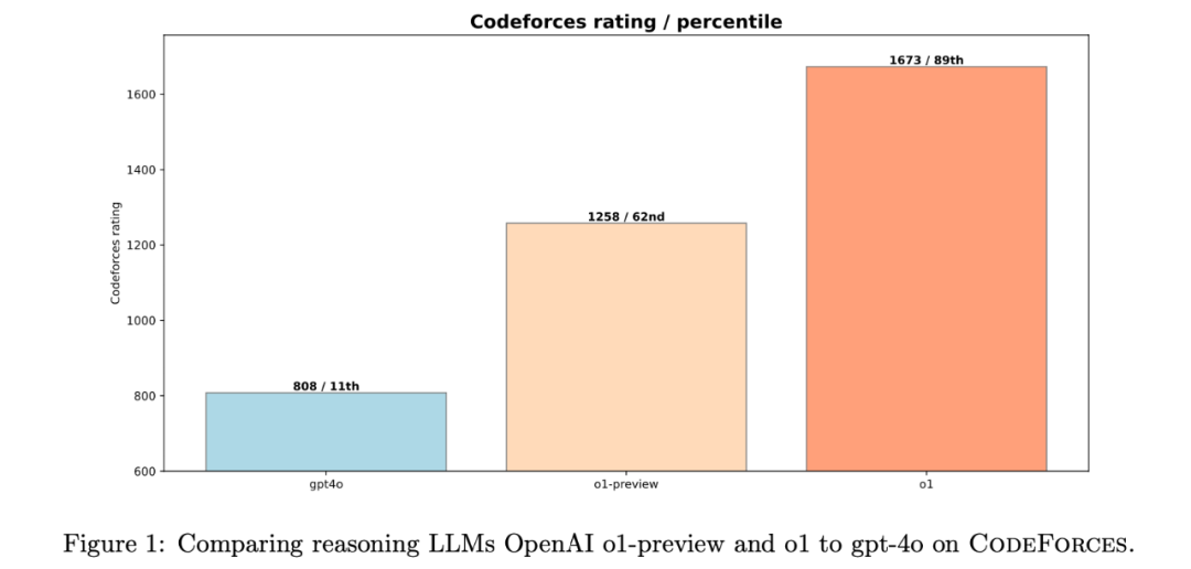 數據説話,效果驚人! 在模擬的 Codeforces 競賽環境中,o1 模型的表現相比之前的模型 大幅提升。 它的 Elo 評分從 1258 分 (62nd percentile) 直接躍升到 1673 分 (89th percentile)!