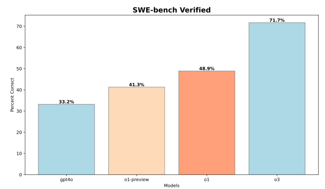 o3 模型在 SWE-bench Verified 數據集上,相比 o1 模型,Pass@1 提升了 22.8%! 這表明,強化學習不僅能提升 AI 的競賽編程能力,也能有效提升其在更廣泛的軟件開發領域的應用能力