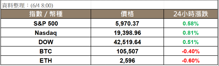 美國數據顯示,儘管對川普總統關稅戰引發的風險感到擔憂,但美國勞動力市場依然保持強勁。輝達周二收漲 2.8%,市值升至 3.45 兆美元,超越微軟成全球市值最高的上市公司。比特幣昨晚一度衝高至 106,794 美元,截稿前回落至 105K 上方,近日上漲缺乏動能,比特幣 ETF 已連續三天呈現淨流出。而以太坊 ETF 則自 5/16 起連續 11 天呈現淨流入。