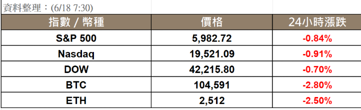 由於人們越來越擔心中東緊張局勢升級可能引發美國更直接的介入,油價上漲,美股下跌。加密貨幣亦全數下跌,比特幣回落至 104K,ETH 截稿前報在 2,512 美元。市場將密切留意今日聯準會利率決策和主席鮑威爾的會後記者會。