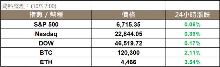 OpenAI 最新一筆交易讓公司估值衝上 5,000 億美元,支撐了晶片股的上漲,推動美股續創新高。加密市場上漲 2.56%,比特幣 (BTC(載入失敗: 網路錯誤)) 在今晨一度觸及 121K,以太幣 (ETH(載入失敗: 網路錯誤)) 一度觸及 4,516 美元,24 小時漲幅達 3.54%,BNB(載入失敗: 網路錯誤) 今晨再創歷史新高,來到 1,099 美元,今年迄今已上漲逾 55%。加密市場在美國政府關門後反而呈現強勁的走勢。