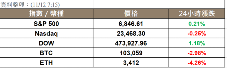 由於軟銀出清輝達持股,人工智慧板塊承壓,資金轉往其他板塊,道瓊指數大漲逾 500 點,並創歷史收盤新高。比特幣 (BTC▼) 由昨日高點 107K 一路走跌,截稿前報在 103K 上方,以太幣 (ETH▼) 亦跌落至 3,400 附近。BRN 研究主管表示,比特幣本週的價格走勢可能預示著自 10 月和 11 月初的去槓桿化浪潮以來的首次真正盤整,十萬美元可能是中期底部。