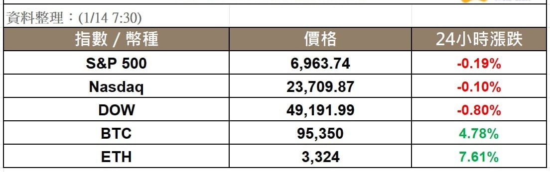 受摩根大通股價走弱拖累銀行類股表現,美股三大指數自高點回落。加密貨幣強勢上漲,整體市值 24 小時內上漲逾 5%。比特幣今晨一度上漲至 96,495 美元,以太幣重回 3,300 美元上方。衍生性商品市場的指標逐漸回溫,有望在突破後引發加速行情。