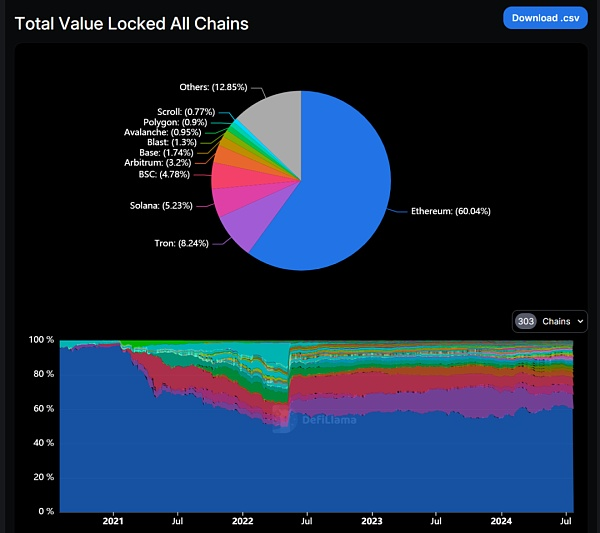 水漲船高;其二在於DeFi生態的完備,幾乎所有的DeFi創新都是在以太坊上發生的;以太坊還通過Wrapped Token的方式引入了大量的wBTC,這也補充了DeFi的流動性;最後,以太坊引入的staking&restaking機制使得大量的LST/LRT被發行出來,造出了大量的TVL。