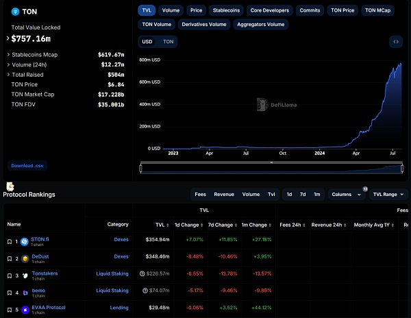 對於TON來講,當前鏈上的第一大資產為Toncoin,市值約為17.5B,而第二大的資產應該為Tether授權發行的USDT,於7月21日超過730M,在所有區塊鏈中排名第五。而根據DefiLlama的數據顯示,TON生態當前的TVL為757M,顯示出明顯的不足。