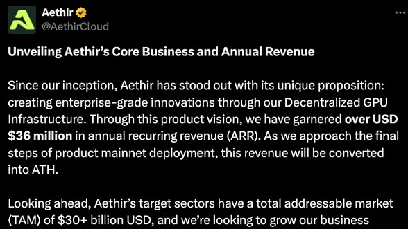 上週,Aethir 宣佈他們的 ARR(年度經常性收入)為 3600 萬美元,這將使他們在今年的收入排名前 20 的加密協議之列。