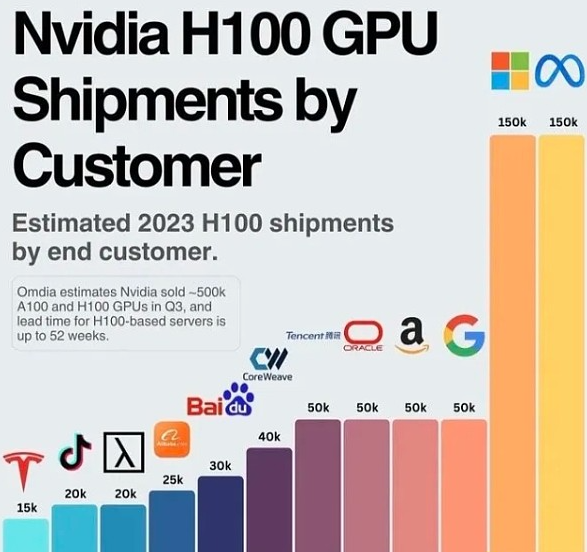 這場競賽的有趣之處在於,它是由一個簡單的原則驅動的。如果你在生態系統中添加更多的 GPU 和數據,人工智能就會變得更聰明。這就像一條從左下角到右上角的線,隨著人工智能智慧的增加。這所需的 GPU 類型至關重要。你不能在消費級 GPU 或低功耗顯卡上做到這一點。人工智能競賽中的所有大公司,無論是在訓練方面還是在應用方面,都使用企業級 GPU。在過去一年半到兩年的時間裡,他們一直在尋找的具體型號是 Nvidia 的 H100 GPU。