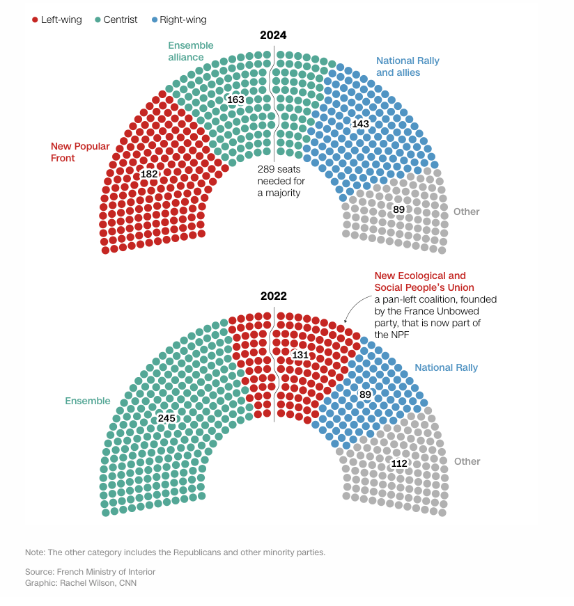 While the leftist New Popular Front (NPF) won the most seats, avoiding a far-right government, Marine Le Pen’s National Rally party gained its highest ever seat count and became the largest individual party in the parliament. Meanwhile, Emmanuel Macron’s centrist Ensemble party finished second after a runoff election.