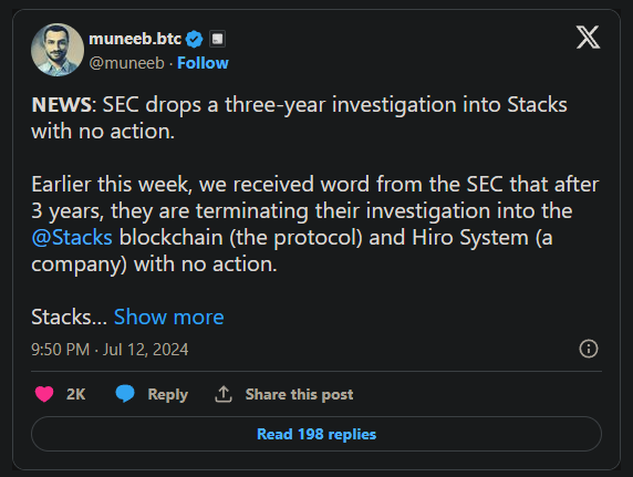 UPDATE (July 12, 2024, 14:10 UTC): Adds tweet from Muneeb Ali; adjusts headline to say probe looked at Stacks protocol, not just the Hiro entity.